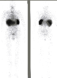 Hierboven een voorbeeld van een zogeheten SAP scan bij een patiënt met AL amyloïdose. Dit onderzoek is ontwikkeld in Londen door Prof. P.N. Hawkins en Prof. M.B. Pepys en wordt in samenwerking met hen in Groningen (afdeling Nucleaire Geneeskunde, hoofd dr. P. Jager) toegepast. Bij dit onderzoek wordt het SAP eiwit (SAP staat voor serum amyloïd P component) gekoppeld aan een geringe hoeveelheid radioactief jodium (123-I). Dit SAP is geïsoleerd en gezuiverd uit het bloed van bloeddonoren. Het SAP gedraagt zich na inspuiting in de bloedbaan als een soort spoorzoeker en bindt zich aan (makkelijk toegankelijke) hoeveelheden amyloïd in vitale organen (zoals lever, nieren, milt, bijnieren, gewrichten en beenmerg, maar bijvoorbeeld niet in het hart).